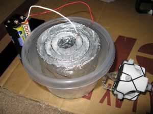 04.30.11 – As mentioned in the book in the section Device 2.0, this crude Joe-Cell experiment was the first time I was able to get the Joe-Cell to the first stage. The Joe-Cell was made hastily with aluminum foil lined plastic cylinders from some plastic bottles. 8 – 1.5 volt batteries in a series were used to supply the power (approx. 12 v). Filtered tap water was added and the voltage was applied with no reaction. As soon as the device was placed near the Joe-Cell an immediate reaction started, as indicated by the white bubbles and foam. There is a relationship between the two devices that should be explored by more qualified people.