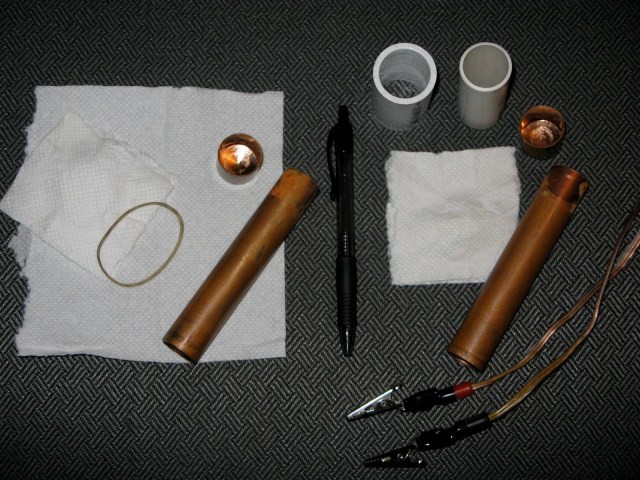Parts used: One audio amplifier at least 20 watts per channel. Two 4-3/4 copper tubes with an 7/8 outside diameter bought a the local hardware store, plumbing supplies. Two copper end caps 7/8 inside diameter (standard in the US). One set of alligator clips, about 12 feet of speaker wires cut into two six foot sections (you want enough length to be able to move freely, too short and you’ll be constrained), paper towels, a rubber band, one RCA to mini stereo cable long enough to reach your computer (Radio Shack). My version includes a PVC light schedule 1 inch diameter pipe and two 1 inch couplers.