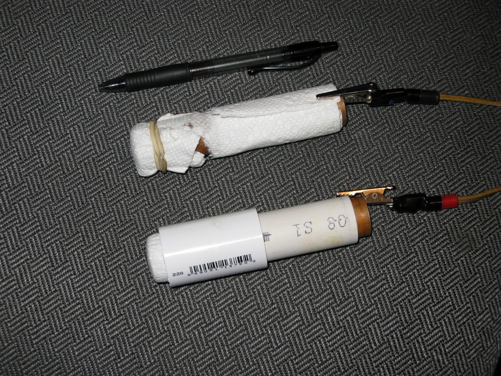 The above image shows the electrodes ready for use. The top is the simplified version and my version is at the bottom. The pen is used to help provide a sense of scale. The top version uses a small piece of paper towel doubled and folded to make a square and held in place with a rubber band. The dry paper towel insulator is wrapped around the length of the tube and insulates the current from traveling through your hand. The end caps are then wet with a salt water solution. The concentration of the saline solution can enhance or impair the electrical pathway from the electrodes. The paper towel insulator must remain dry.
